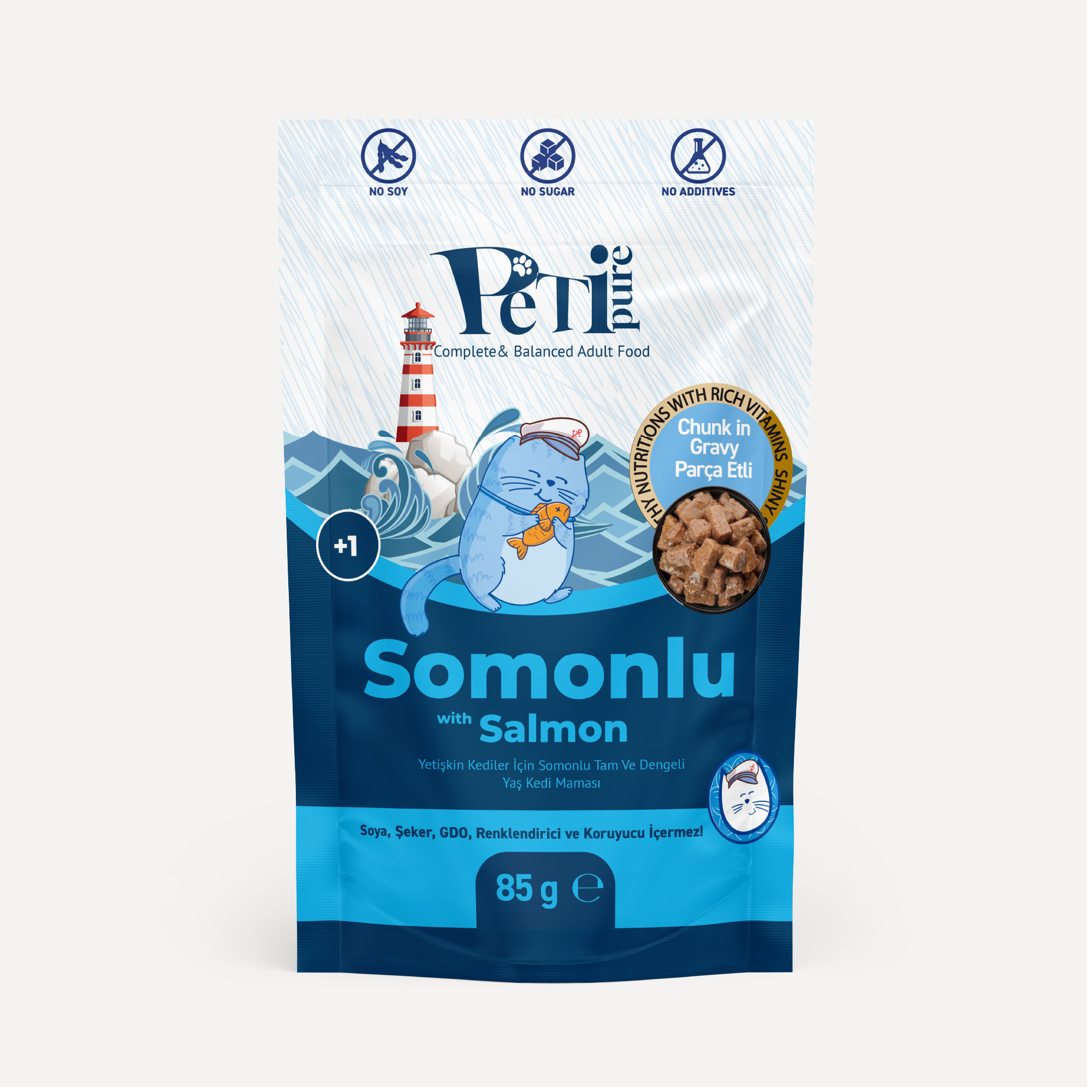 1 yaşından itibaren yetişkin kedilerin günlük beslenme ihtiyaçlarını karşılamak üzere formüle edilmiş somonlu tam ve dengeli yaş kedi mamasıdır.